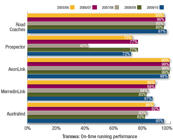 Our OTR improved in most areas during 2009/10 with AvonLink and road coach services maintaining the consistent high levels achieved since 2003/04. The Prospector and MerredinLink services were adversely affected by speed restrictions applied around track and culvert worksites. The Australind improved significantly following an extended period of track work in 2008/09. The following results were achieved: Australind - 95 per cent of services arrived within 10 minutes of schedule AvonLink - 98 per cent within 10 minutes MerredinLink - 87 per cent within 10 minutes Prospector - 72 per cent within 15 minutes Road coaches - 97 per cent within 10 minutes |