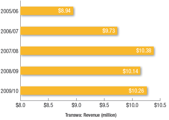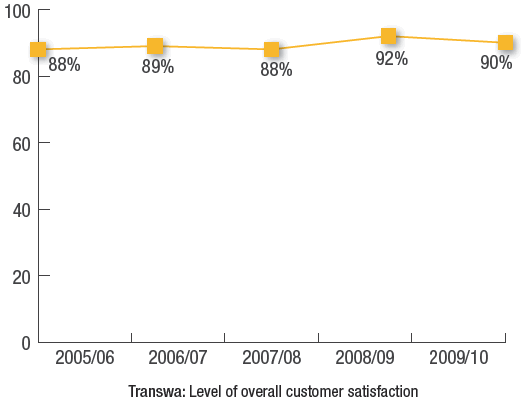 Transwa maintained a high level of overall customer satisfaction indicated by the 90 per cent PSM result for 2010. The attributes of cleanliness, punctuality and on-board comfort again rated highly reflecting Transwa’s commitment to continuous improvement. |