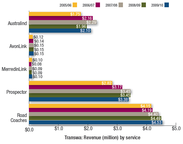 There was an overall 1 per cent increase in revenue in 2009/10 as a result of fare increases introduced from 1 July 2009 partially offset by a 3.7 per cent reduction in patronage. Catering revenue helped increase results for the Australind above last year’s figure which was affected by an extended period of service disruptions due to track works.