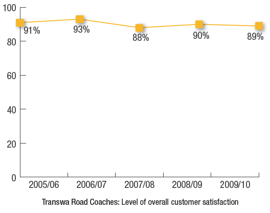The 2010 PSM shows 89 per cent of customers either satisfied or very satisfied with Transwa road coach services, down 1 per cent from 90 per cent the previous year.