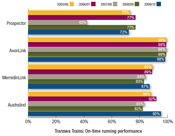 Due to a variety of factors, including the general economic downturn, patronage on Transwa rail services fell by 2.1 per cent mostly reflected on the Prospector and AvonLink services.