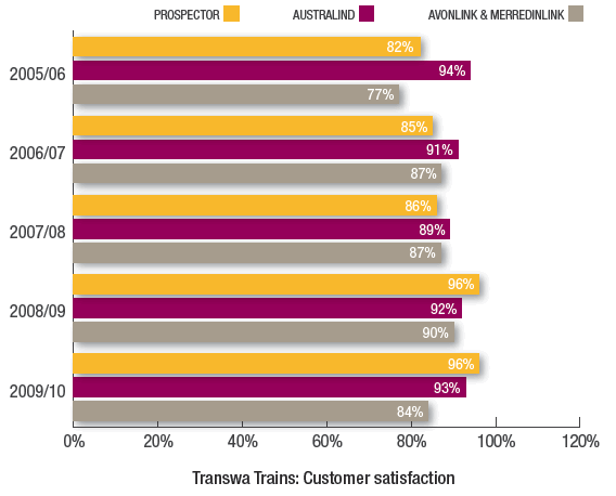The PSM continued to show excellent overall satisfaction levels for Transwa trains, with the Prospector remaining steady at 96 per cent and satisfaction with the Australind improving slightly to 93 per cent. The combined results for the AvonLink and MerredinLink were down to 84 per cent from last year’s all time high result of 90 per cent.